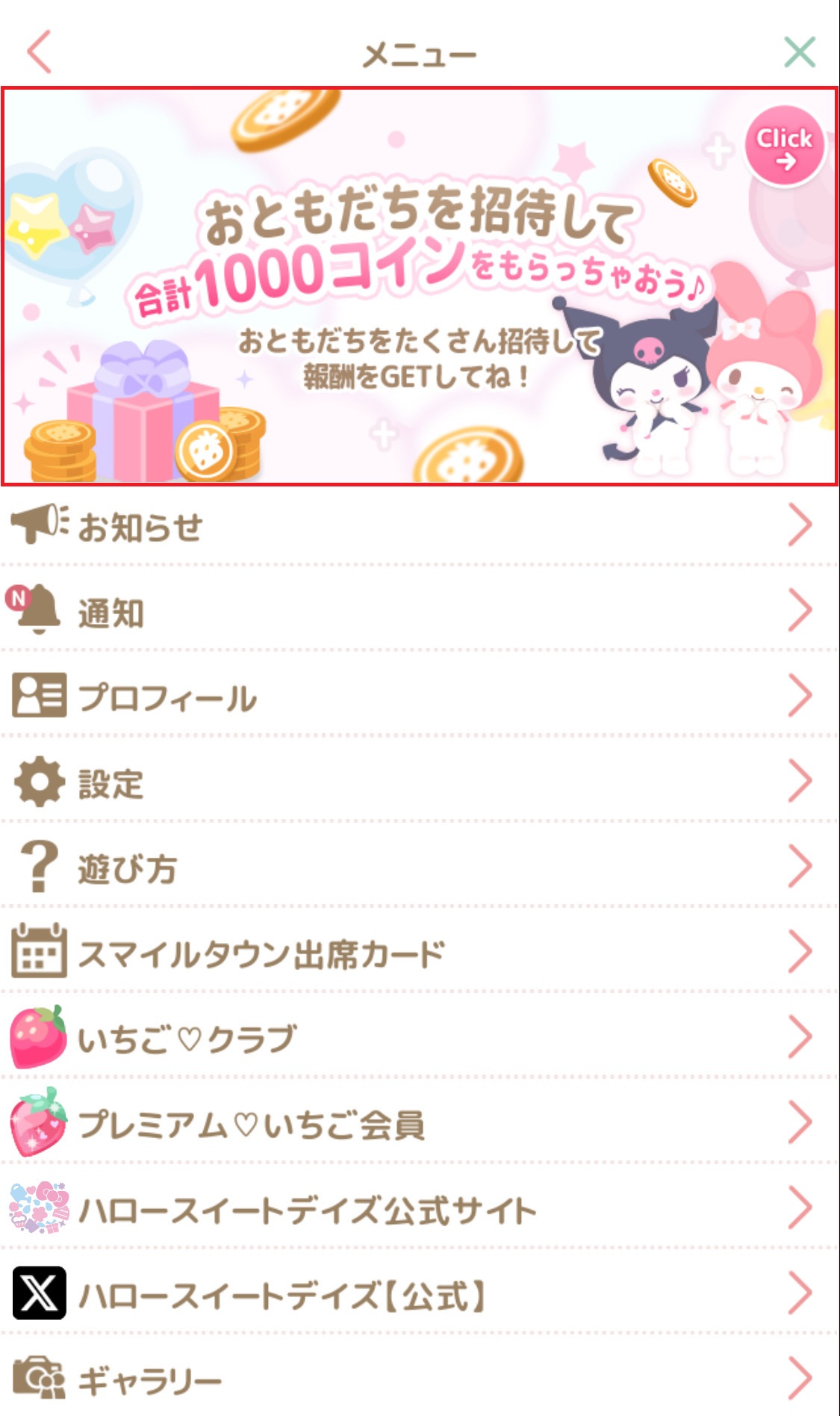A, メニュー画面上部に、おともだち招待のバナーがあります。